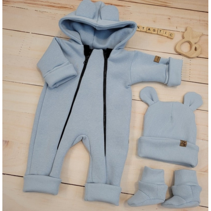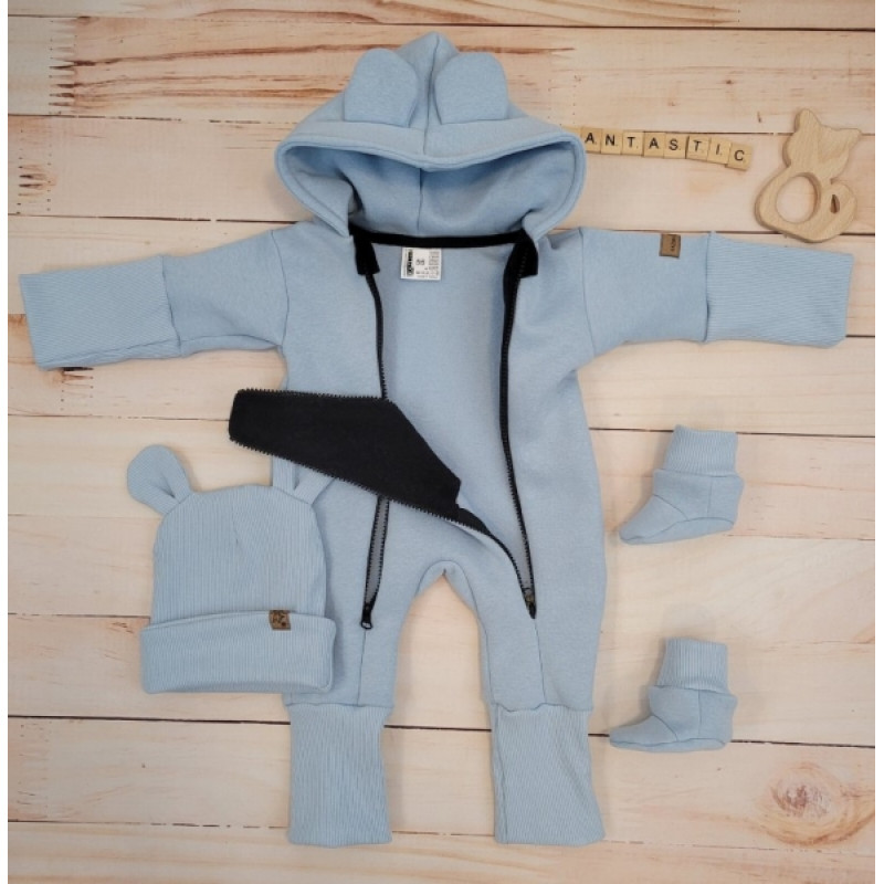 Oteplený detský overal bez šľapiek s kapucňou, čiapočka+topánočky, 3D,Kazum, modrý, veľ.68
