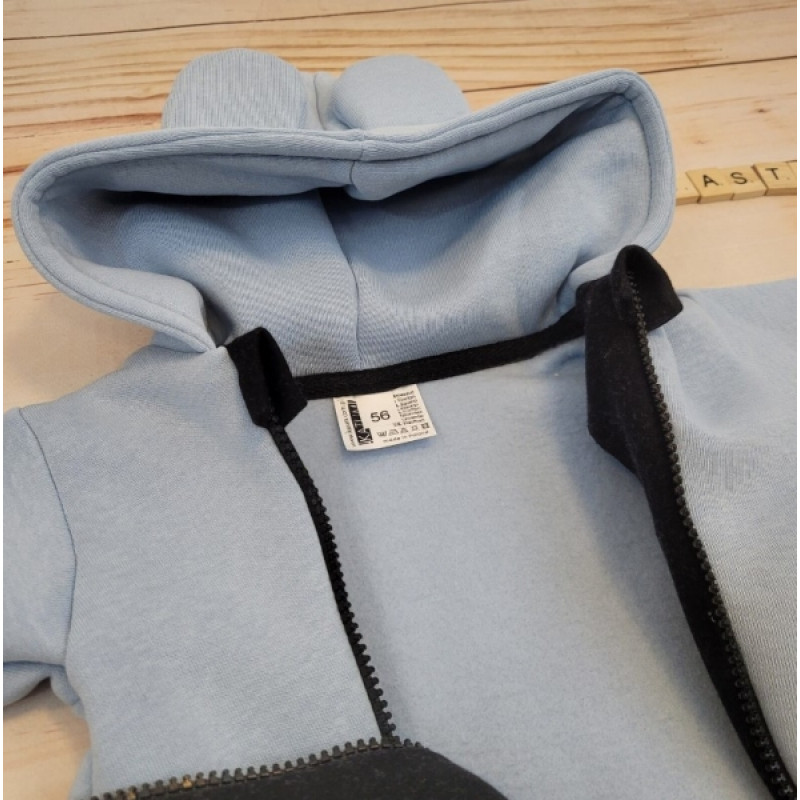 Oteplený detský overal bez šľapiek s kapucňou, čiapočka + topánočky, 3D, Kazum, modrý
