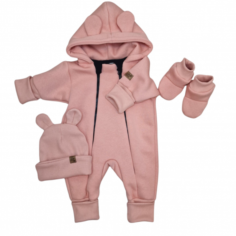 Oteplený detský overal bez šľapiek s kapucňou, čiapočka + topánočky, 3D, koralova