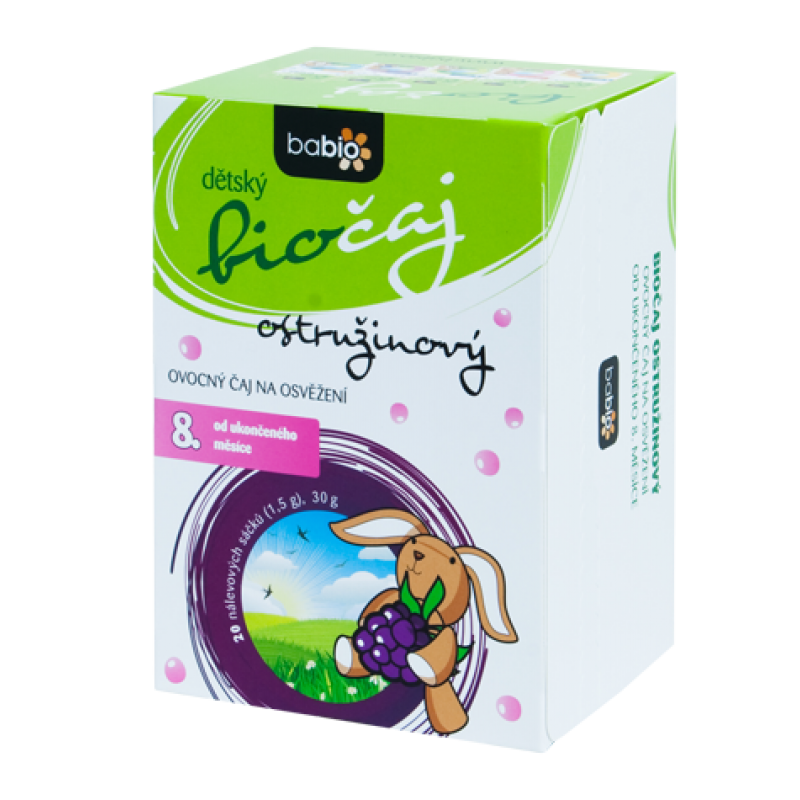 Detský ovocný čaj Babio® -OSTRUŽINOVÝ. Vhodný pre deti od ukončeného 8. mesiaca. Detský černicový biočaj má lahodnú chuť a je skvelým prírodným prostriedkom na osvieženie a doplnenie pitného režimu počas celého roka. Černice, šípky a arónie obsahujú vysoké množstvo vitamínu C. - prirodzene bezkofeínovej, - bez lepku, - bez pridaného cukru, aromatizujúcich a konzervačných látok. Obsah balenia: 30 g / 20 nálevových vrecúšok. Zloženie: ostružina * - plod (Rubus fructicosus), šípky * - plod (Rosa canina), arónie * - plod (Aronia melanocarpa), malina * - list (Rubus idaeus), brusnica * - plod (Vaccinium vitis idaea), medovka * - list (Melissa officinalis). * Z ekologického poľnohospodárstva. Kladne posúdené Českou pediatrickou spoločnosťou. Pre deti od ukončeného 8. mesiaca.