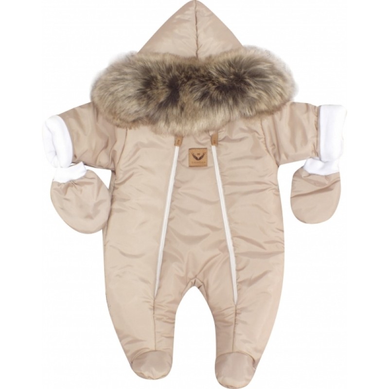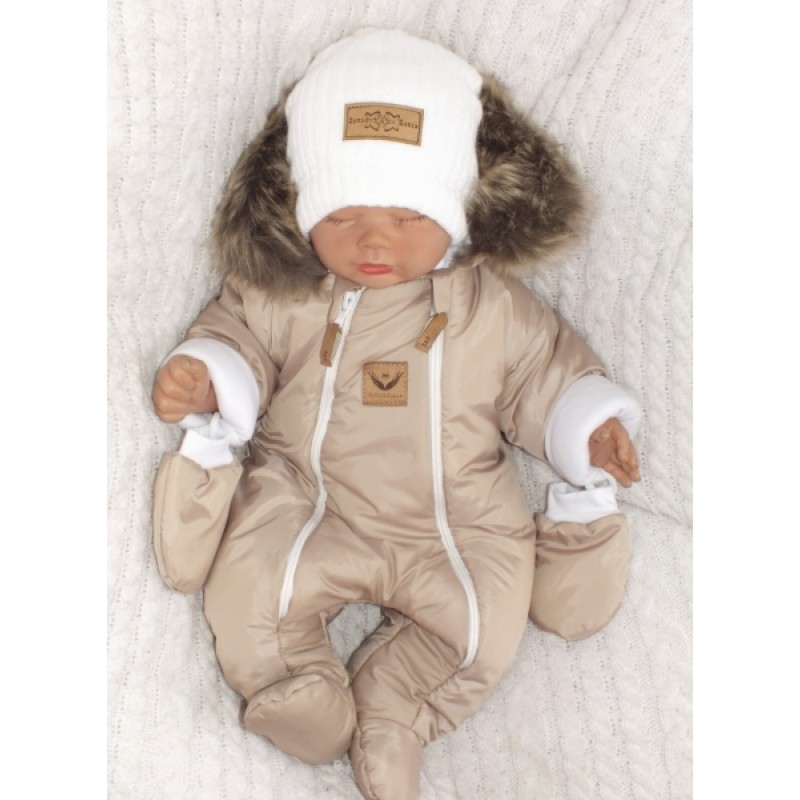 Z&Z Zimná kombinéza s dvojitým zipsom, kapucňou a kožušinou + rukavičky, Angel - béžový,80