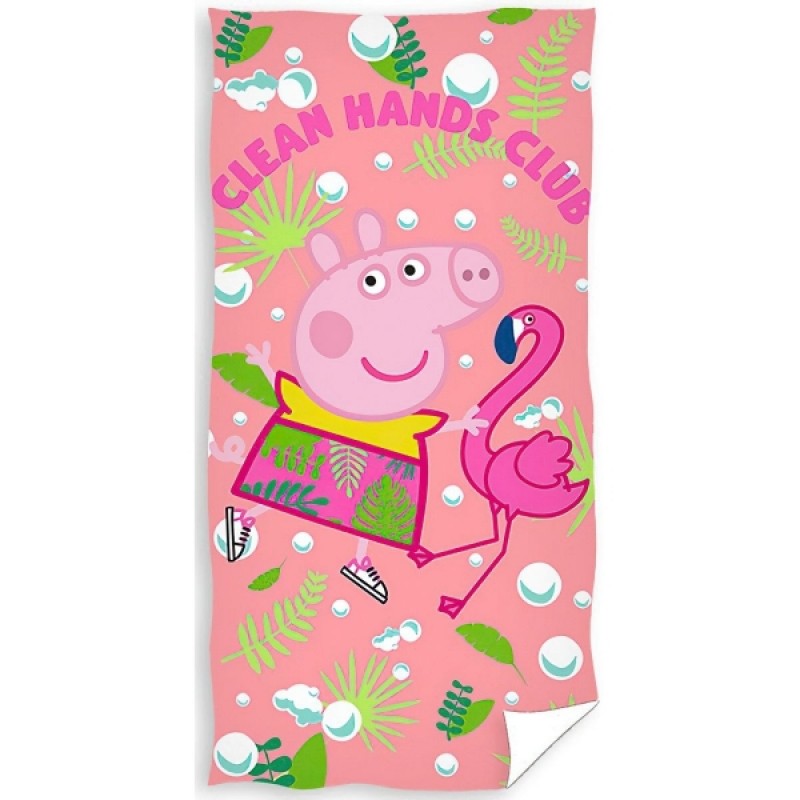 Detská plážová osuška s motívom obľúbenej postavičky prasiatka Pepiny s plameniakom na ružovom podklade so zelenými listami. Vyrobené z vysoko kvalitnej bavlny, ktorá dokonale saje vodu. Mäkké a jemné. Ideálna k bazénu, na pláž a na každodenné použitie. Jedinečný, pútavý vzor s motívom zvieratiek, ktoré deti milujú.